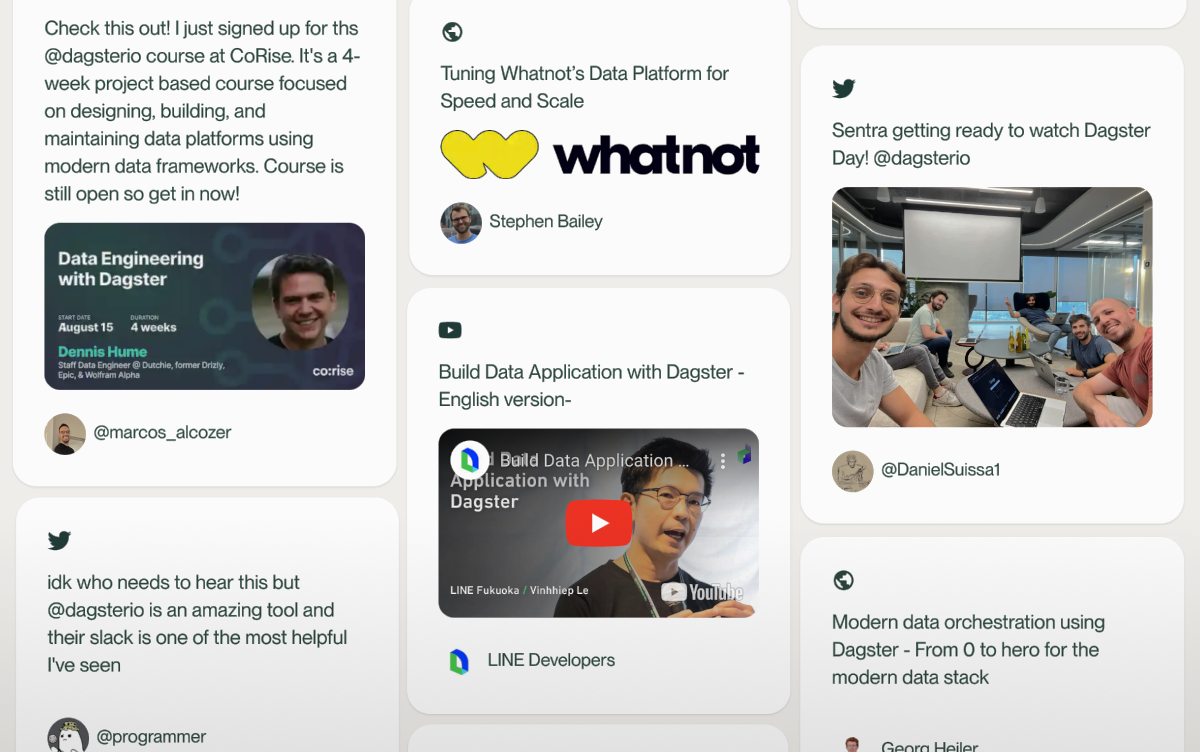 Dagster has a growing community of forward-thinking engineers who see the value of our declarative framework. The Dagster engineering team is directly involved in supporting both open source and Dagster Cloud users.